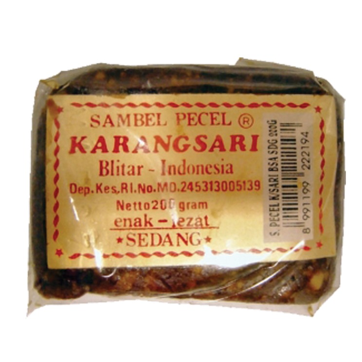 mittel scharfe Erdnußsauce 200g von Karangsari Zutaten: Erdnuß, Palmzucker, Chili, Salz, Knoblauch, Kencur, Zitronenblatt Tamarin